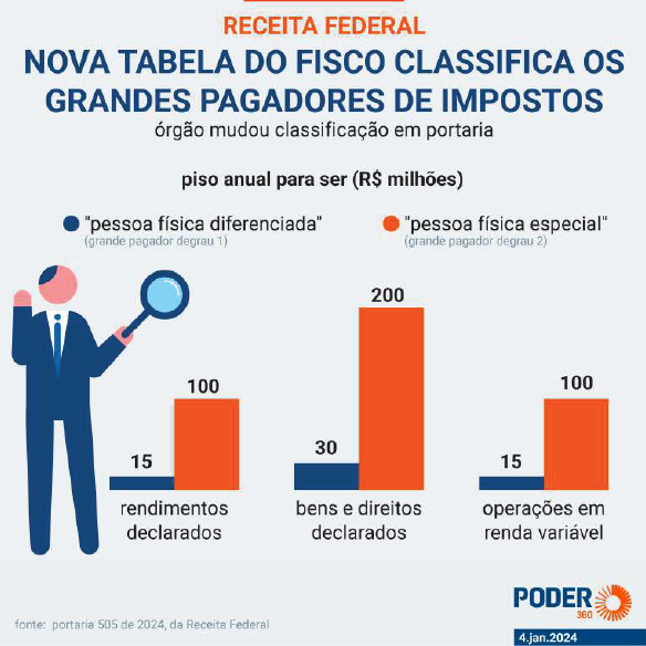 As mudanças nas regras para ser “pessoa física diferenciada” vieram por meio de uma portaria da Receita Federal (nº 505 de 2024) publicada na noite de 30 de dezembro. O documento veio sem alarde do Fisco e foi noticiado com mais vigor pela imprensa. Eis a íntegra (PDF – 145 kB).