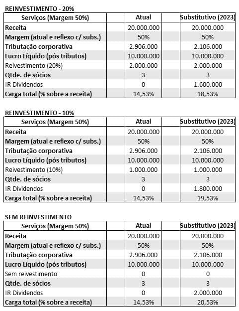 A falta de “justa medida” no que respeita ao lucro presumido pode ser visualizada a partir de situações práticas. Considerando os termos do projeto, empresas com lucratividade de 50% da receita sofrerão, a depender unicamente de sua margem de reinvestimento, aumentos dos atuais 14,53% de carga sobre a receita para até 20,53% (ou mais). Vejam-se alguns exemplos [6]: