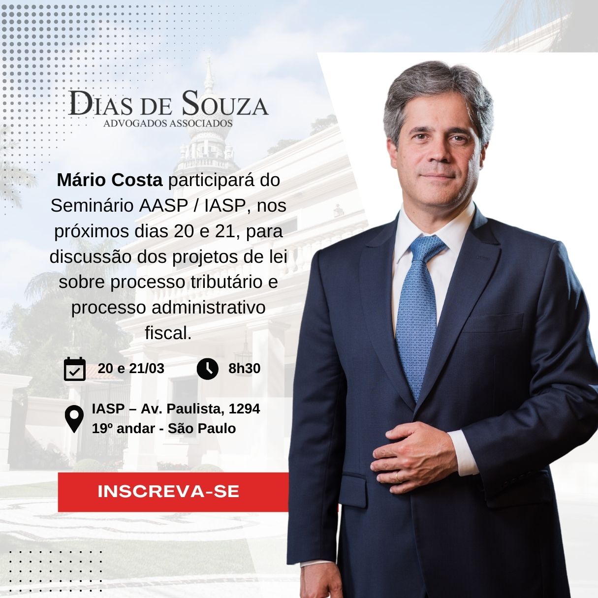 Mário Costa participará do Seminário AASP / IASP, nos próximos dias 20 e 21, para discussão dos projetos de lei sobre processo tributário e processo administrativo fiscal